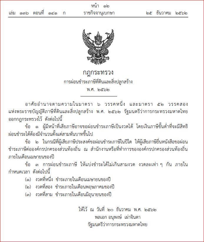 สรุปแล้วภาษีที่ดินและสิ่งปลูกสร้างผ่อนได้หรือไม่